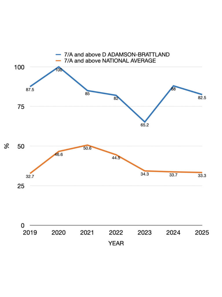 100% pass rate and a percentage of high grades (i.e. grade 7 and above) significantly outperforming the National Average and a course delivered by a tutor with extensive experience.