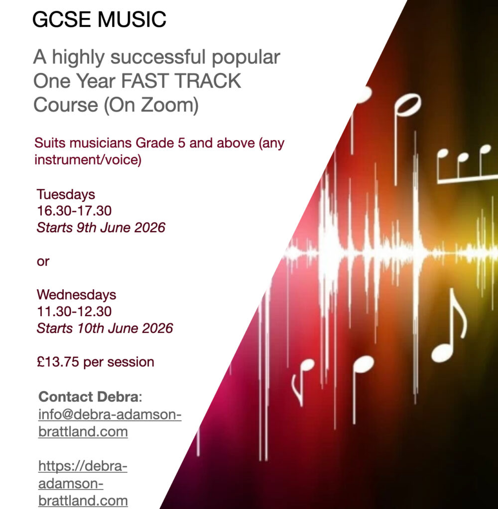 Debra’s submission date for the two performances is always 14th February (Valentine’s Day) in the year in which the exam is taken. Debra will provide guidance regarding the exact requirements and marking criteria to be followed. Please note the course does not include instrumental/vocal tuition. Most students have instrumental and vocal tuition alongside GCSE music.